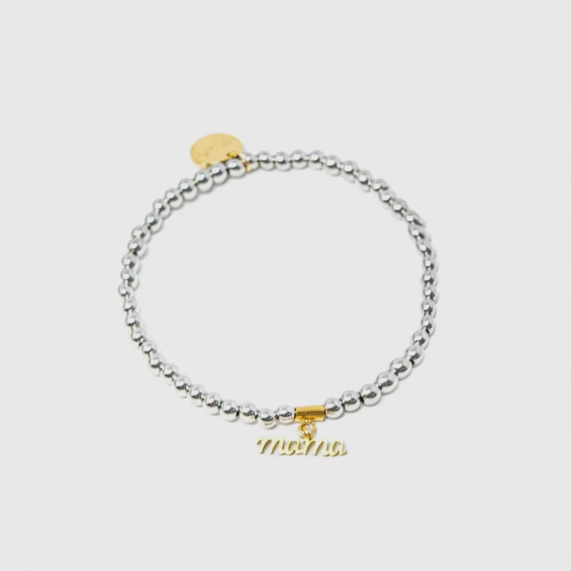 Silver beaded bracelets with "mama" in gold lettering. The perfect stackable bracelet for all seasons.